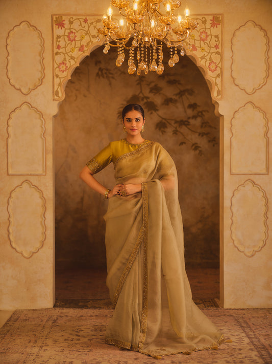 TAJRA GOLD ORGANZA SAREE WITH ZERO-NECK BLOUSE