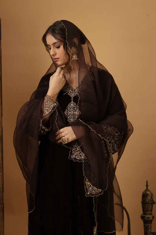 Zar-e-Makhmal Brown Kali Kurta Set