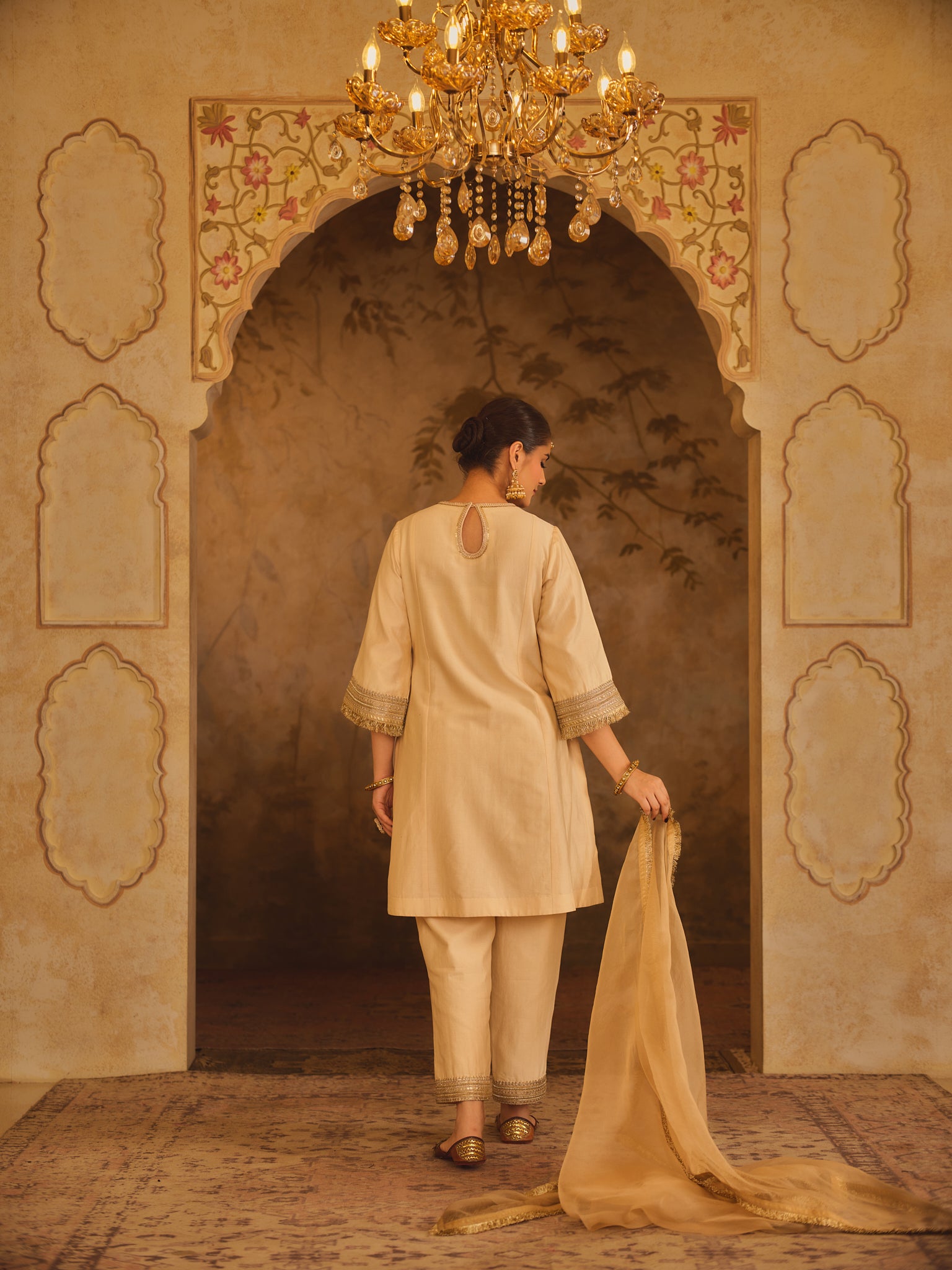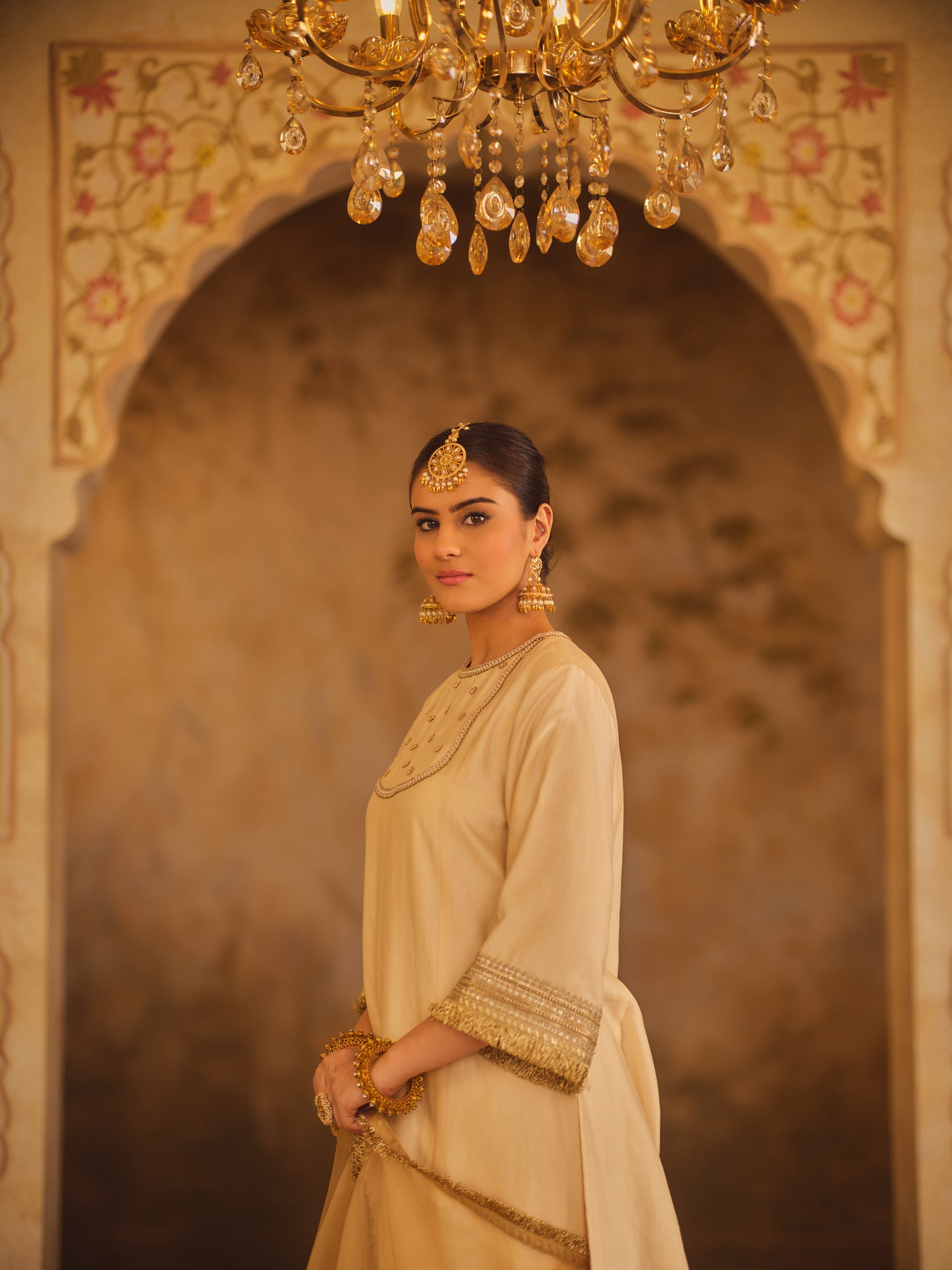 Cream A-Line Kurta featuring Zero-neck Kurta and long sleeves with Beautiful Gota Combination borders. Paired with Narrow Pants and a fringe lace beige dupatta.