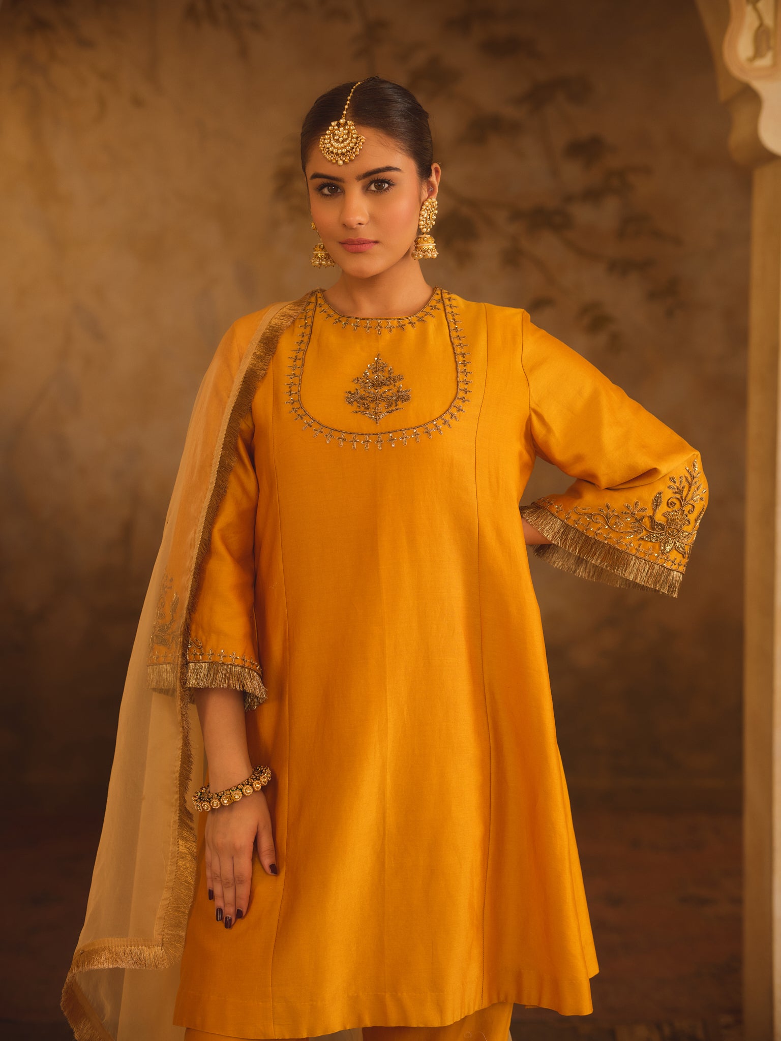 Mustard A-Line Kurta featuring zero-neck Kurta and long sleeves with hand work of Zardozi with Dori, Sequence and Antique pearls. Paired with Narrow Pants having boota hand work on bottom and a fringe lace dupatta.