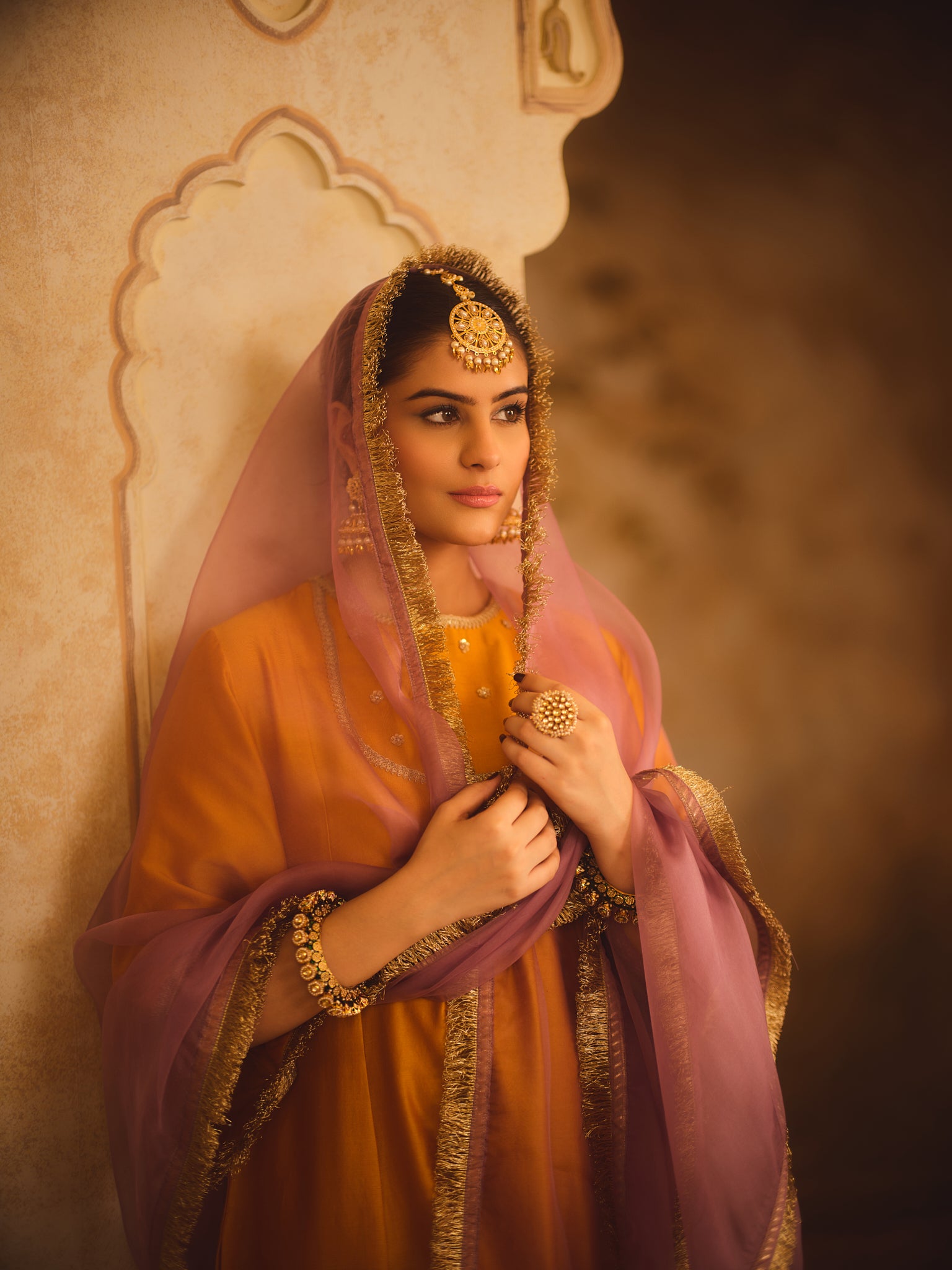 Mustard A-Line Kurta featuring Zero-neck Kurta and long sleeves with Beautiful Gota Combination borders. Paired with Narrow Pants and a fringe lace purple dupatta.