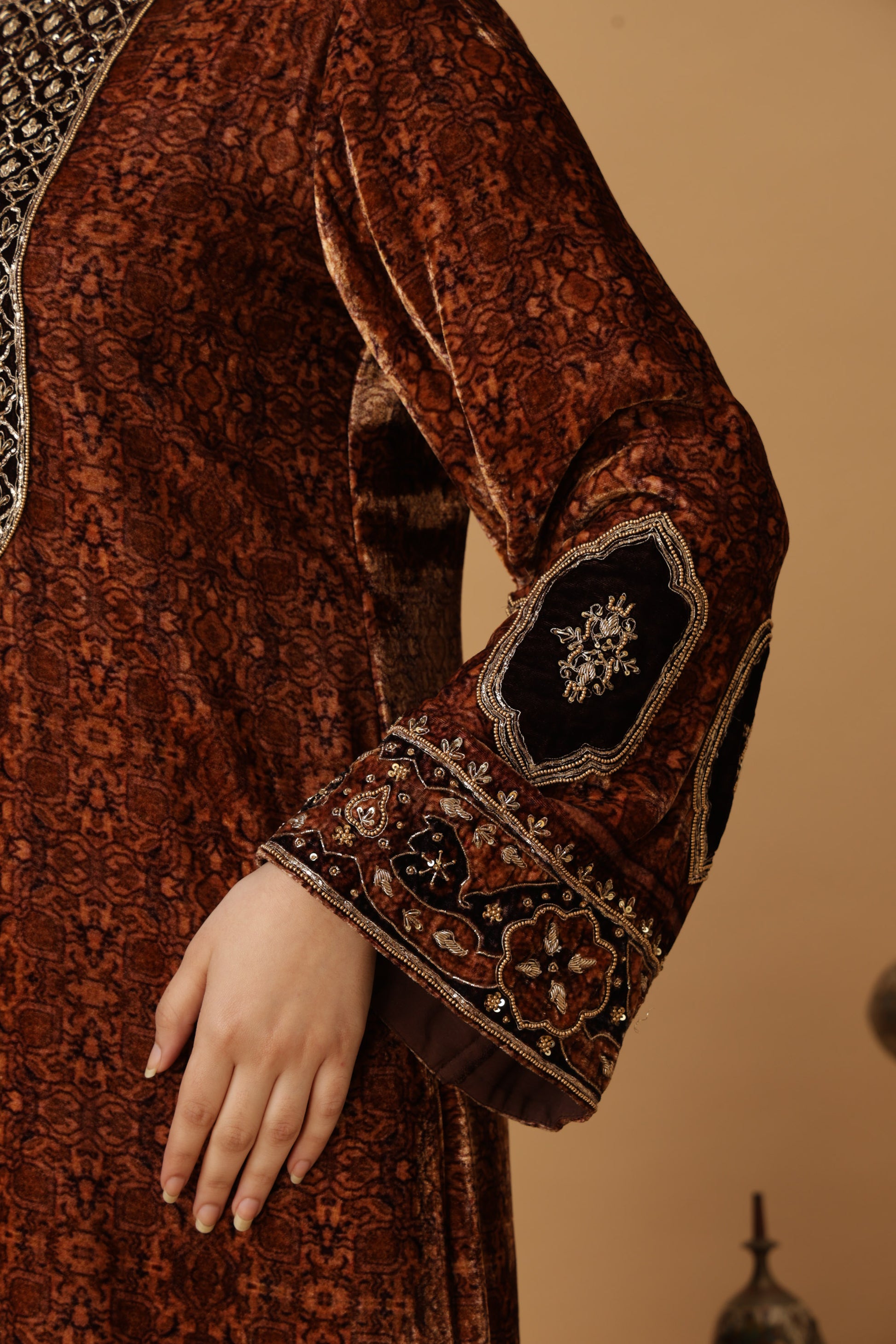 Zar-e-Makhmal Brown Long Kaftan featuring zero-neck and long flared sleeves with hand work of Zardozi with Dori, Sequence and Antique pearls on neck, sleeves and bottom with side Slits on both sides.