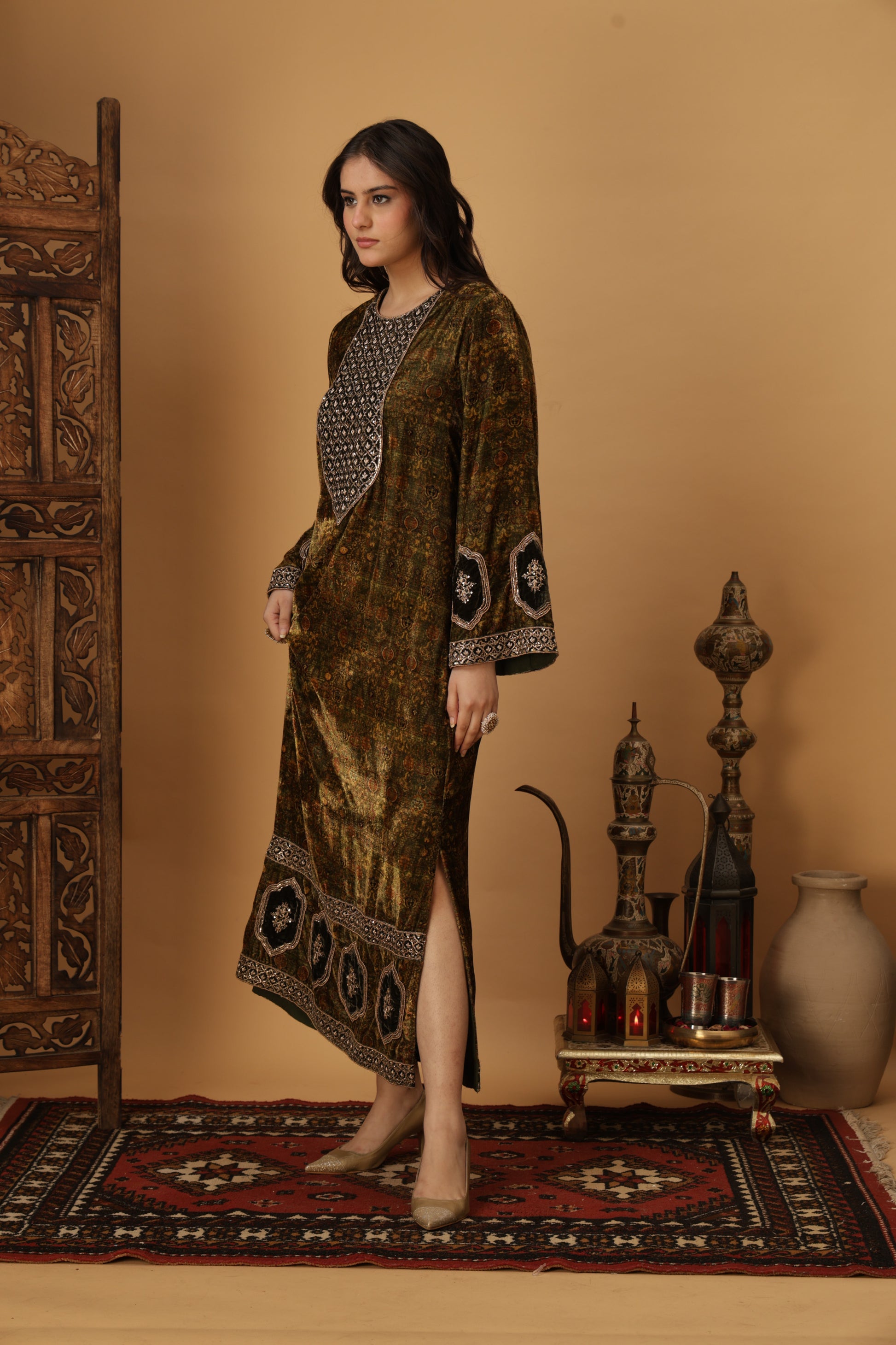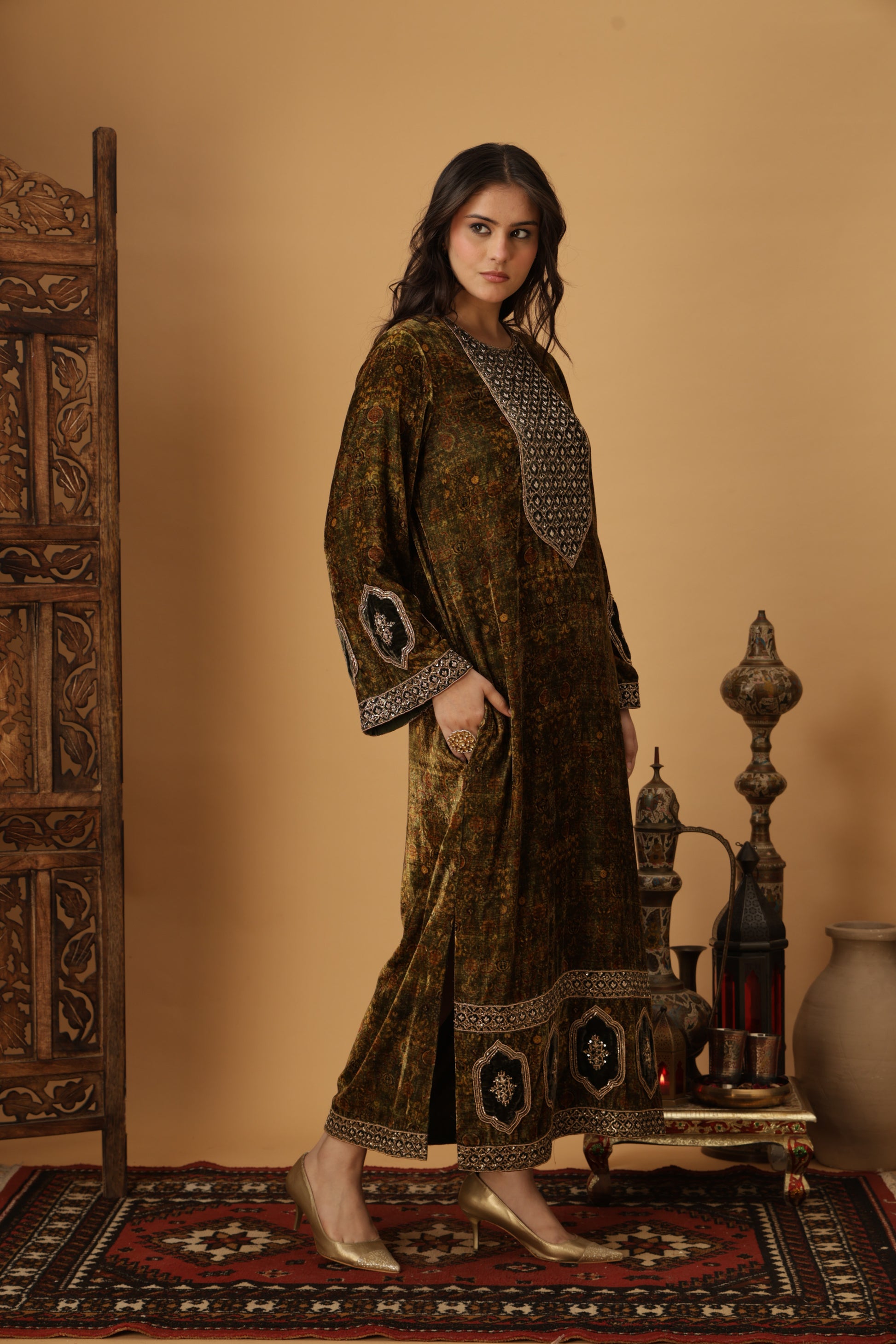 Zar-e-Makhmal Green Long Kaftan featuring zero-neck and long flared sleeves with hand work of Zardozi with Dori, Sequence and Antique pearls on neck, sleeves and bottom with side Slits on both sides.