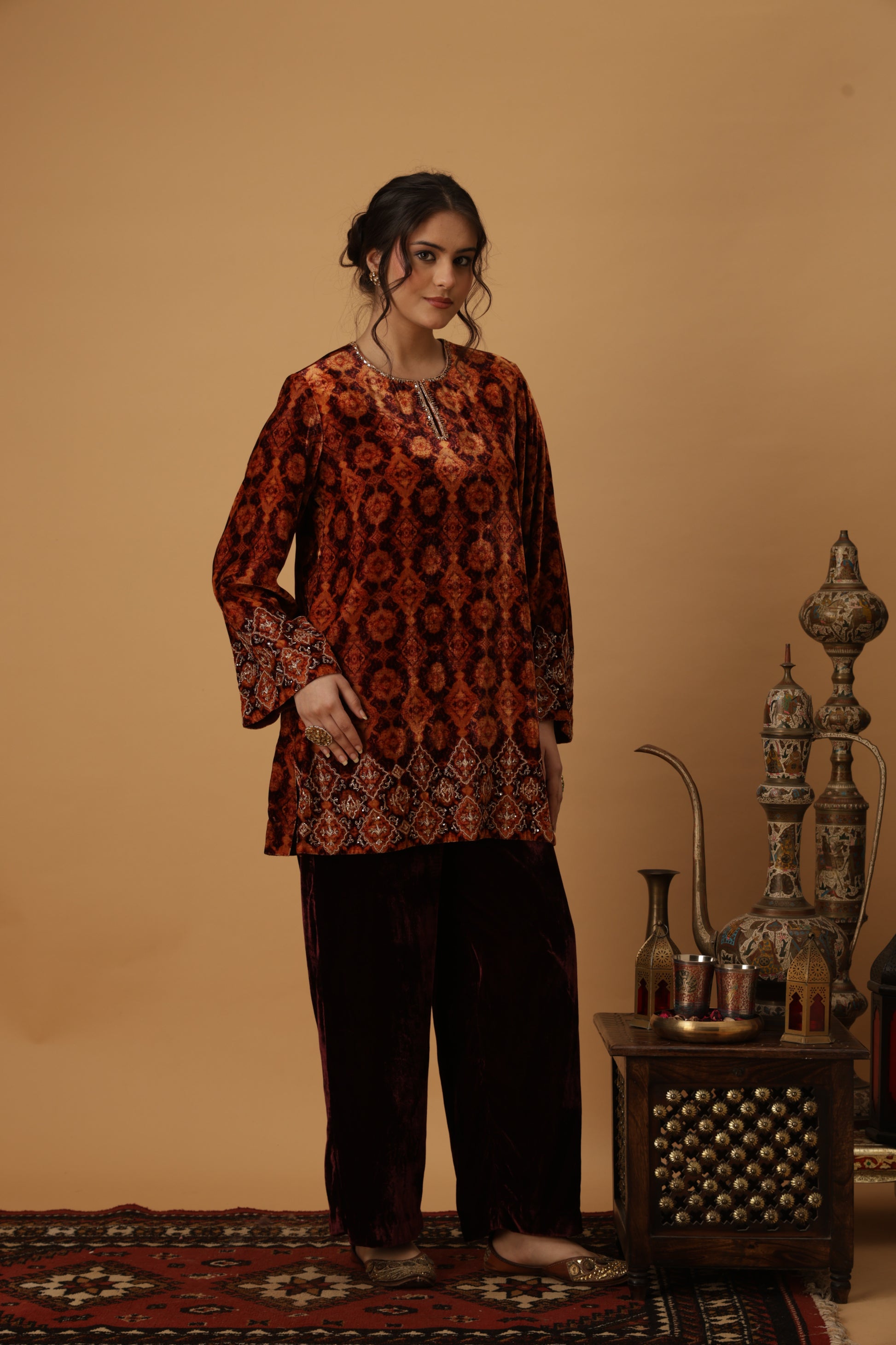 Zar-e-Makhmal Maroon Co-ord Set featuring Short Length Printed Coat with shoulder pads, Round-neck and long flared sleeves with hand work of Zardozi with Dori, Sequence and Antique pearls on neck, sleeves and bottom. Paired with Straight wide leg solid pants.