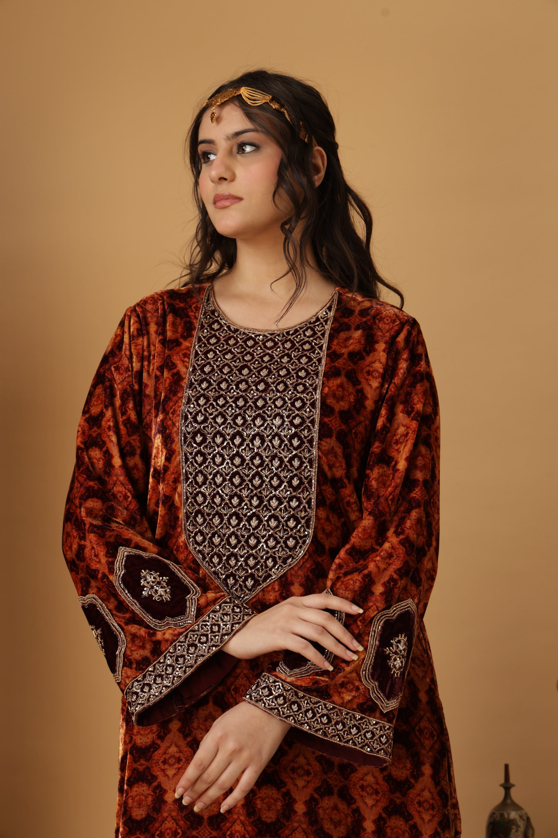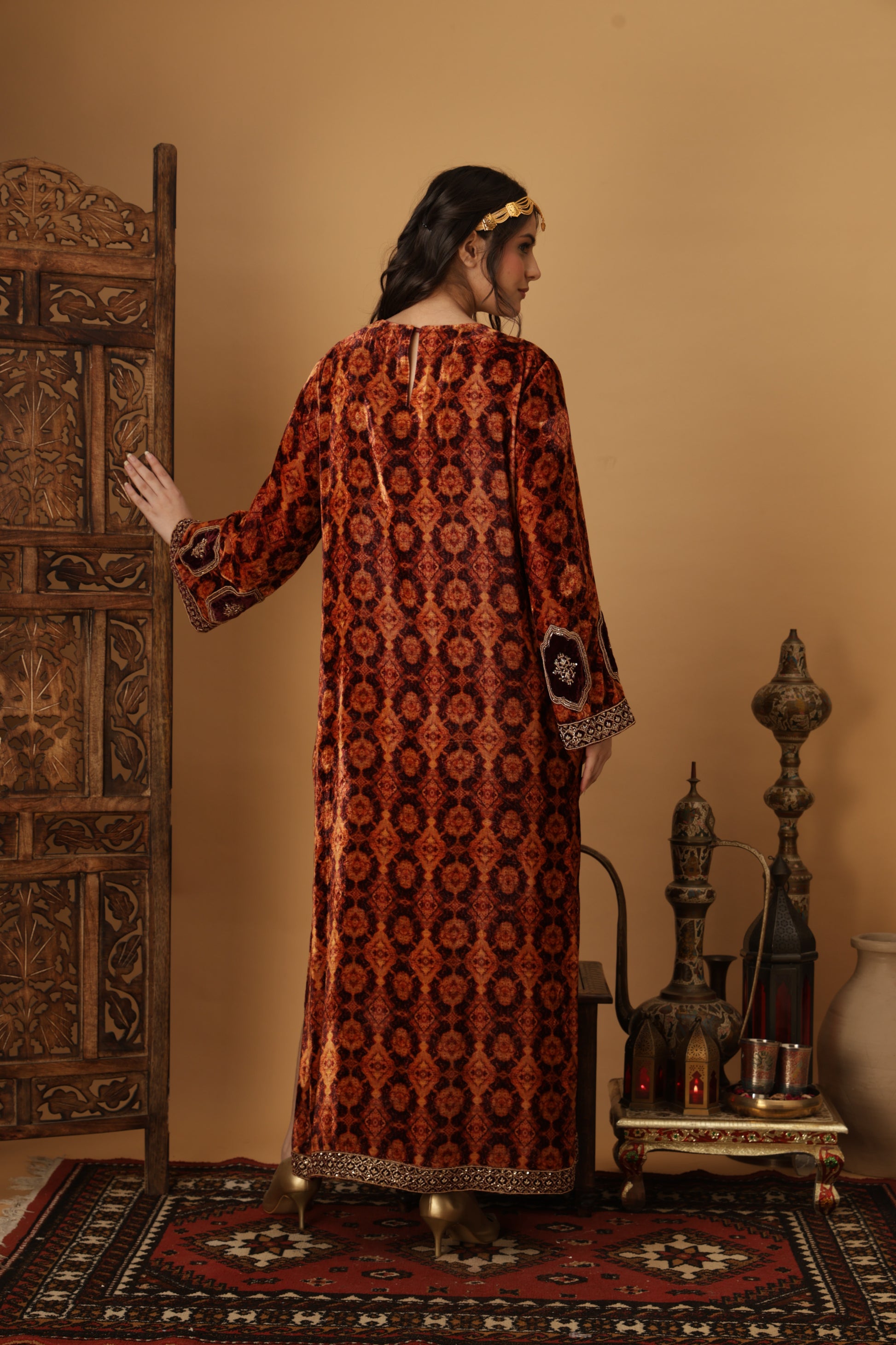Zar-e-Makhmal Maroon Long Kaftan featuring zero-neck and long flared sleeves with hand work of Zardozi with Dori, Sequence and Antique pearls on neck, sleeves and bottom with side Slits on both sides.
